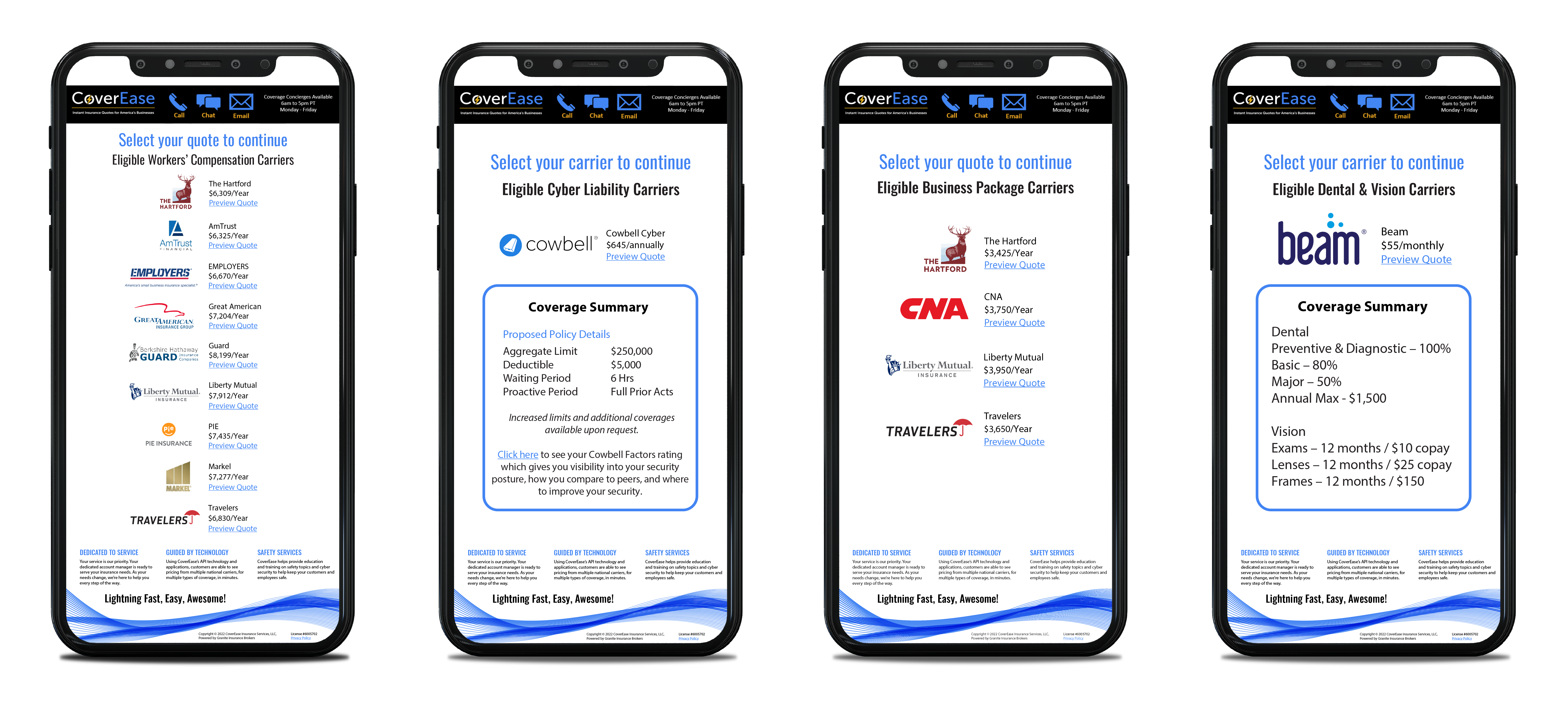 Insurance services provided by CoverEase Insurance Services, LLC and its licensed agents and affiliates. The information contained within these materials are confidential and not to be distributed. Descriptions are general in nature only. Please refer to the terms and conditions of policies offered or purchased. Insurance products are subject to application and underwriting requirements. Pricing depends on a variety of factors including policyholder location. Not all discounts available in all states. Not all products available in all states. Use of and access to this information, site or any of the links contained within this site does not create a relationship between the user and CoverEase. © 2025 CoverEase, Inc. All Rights Reserved.